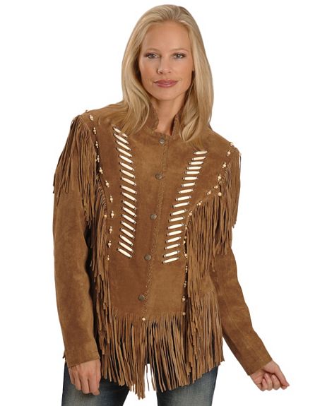This Jacket Boasts A Modest Neckline With Stand-Up Collar And Decorative Brass-Tone Snap Closures At Front Placket. The Leather Jacket Measures (From Back Collar To Hemline) 21", Measurement With Bottom Fringe Is 29". Beautifully Western Leather Jacket Tan Bone Beading & Silver-Tone Stud Accents Pop! Tonal Leather Fringe Makes Quite An Impression.
